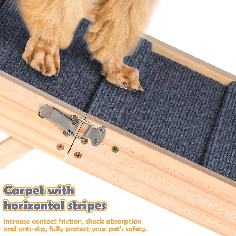 Gemaakt van grenenhout en meerlaags multiplex, ondersteunt deze huisdierhelling tot 25 kg. Het oppervlak heeft een gestreept antislip tapijt en vijf dwarsbalken voor een betere grip om de 15 cm.